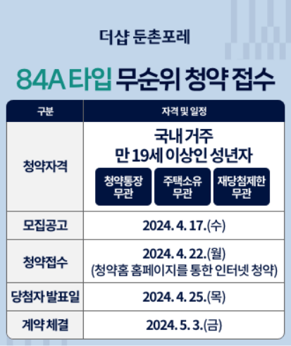 무순위 청약 신청: 2024. 04. 22.(월) 09:00~ 17:30 (현장접수 불가, 청약홈에서 신청)