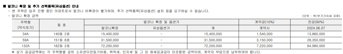 | 계약금 10% (확장비 포함) | 잔금 90% (확장비 포함) | 합계 | 취득세 | |